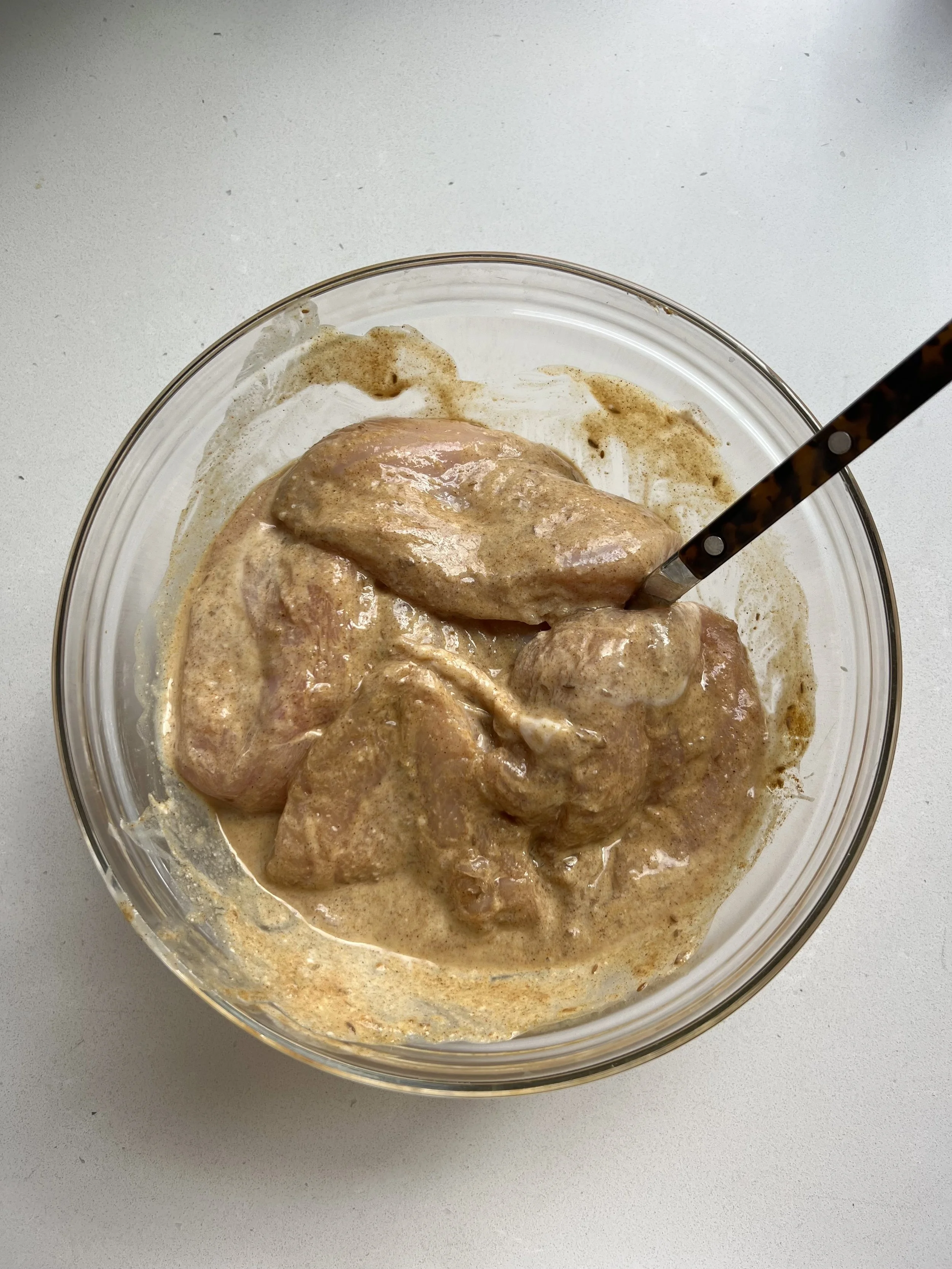 In a bowl, combine coconut yogurt, curry powder, turmeric, cumin, coriander, cinnamon, garlic powder, and sea salt. Coat the chicken thoroughly. Marinate for at least 30 minutes, or up to 8 hours in the refrigerator for deeper flavour.