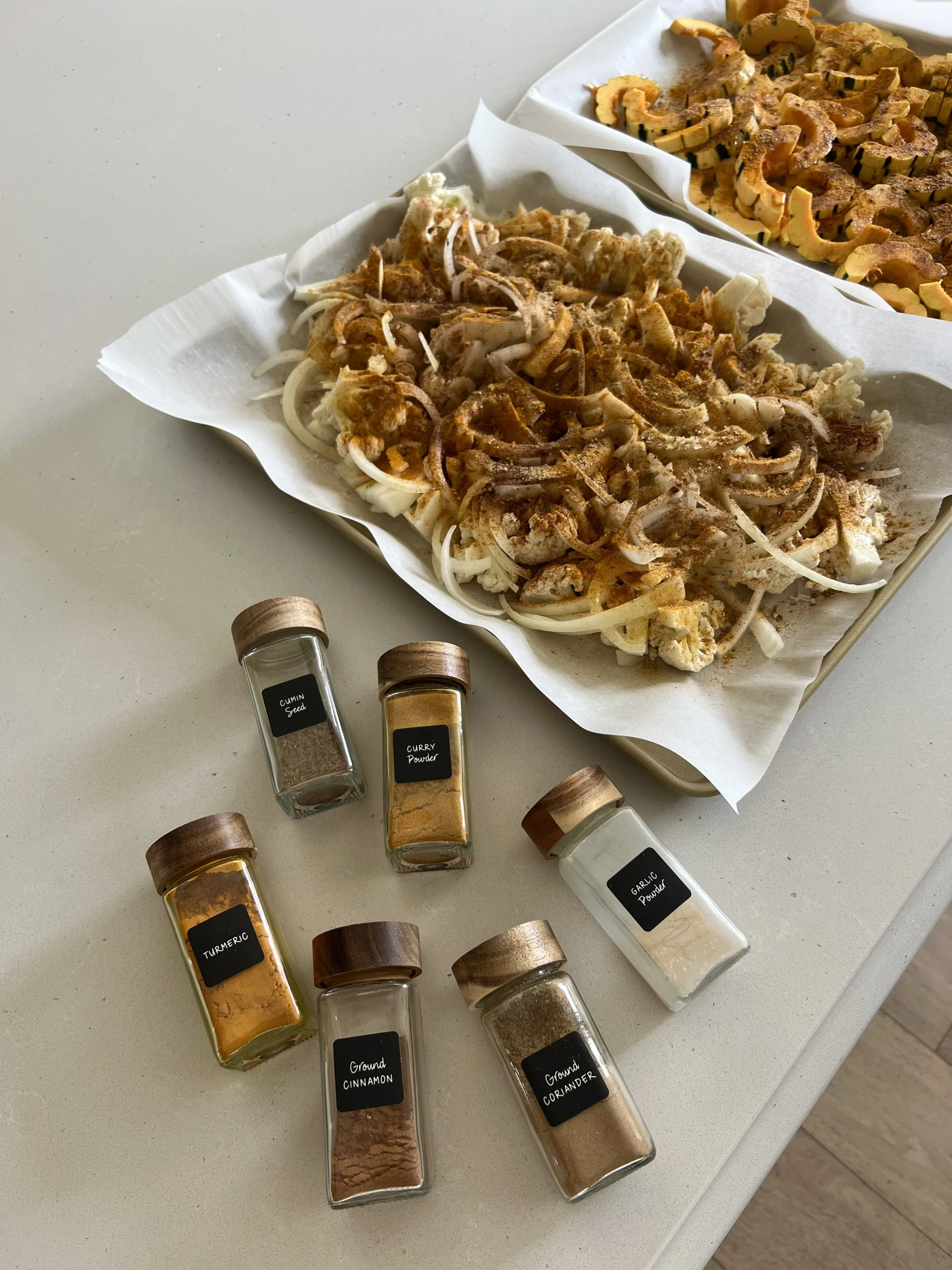 Toss cauliflower, delicata squash, and onion with avocado oil, curry powder, turmeric, cumin, coriander, garlic powder, and sea salt. Spread in an even layer. Roast for 25–35 minutes, flipping halfway, until tender and lightly caramelized. Air fryer option, 375°F (190°C) for 15–20 minutes in batches.